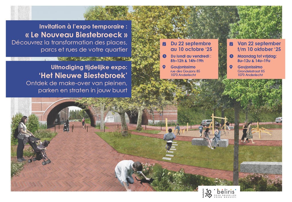 Benieuwd naar wat er allemaal zal veranderen? Beliris organiseert, in samenwerking met de gemeente Anderlecht, een tijdelijke expo ‘Het Nieuwe Biestebroek’ van 22 september tot en met 10 oktober in de wachtzaal van het centrum Goujonissimo (Grondelsstraat 85 in Anderlecht).