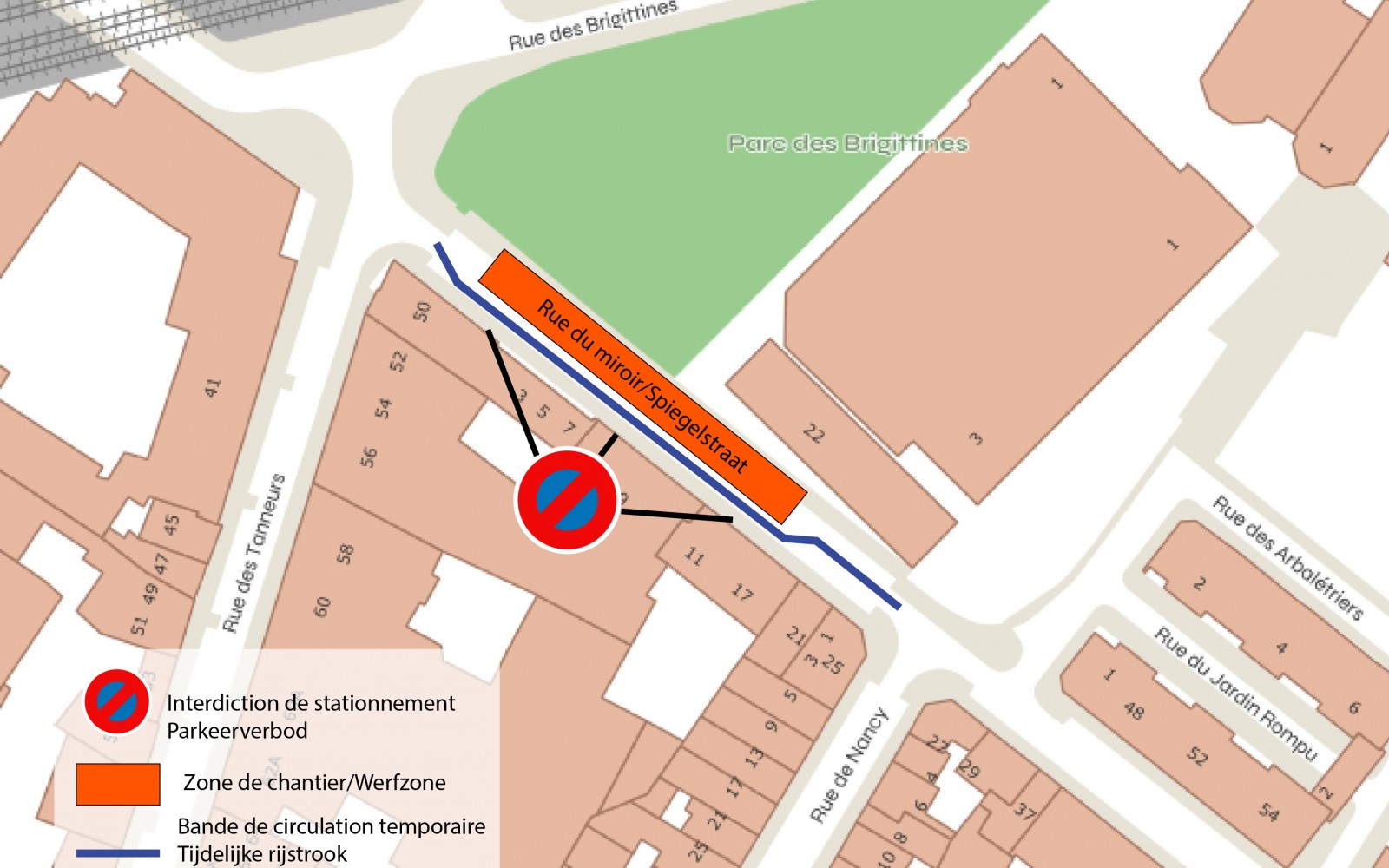 Tijdens de proeven zal er een tijdelijk parkeerverbod gelden in de Spiegelstraat. Wagens kunnen nog altijd door, en rijden via de parkeerstrook omheen de werfzone (zie plan).