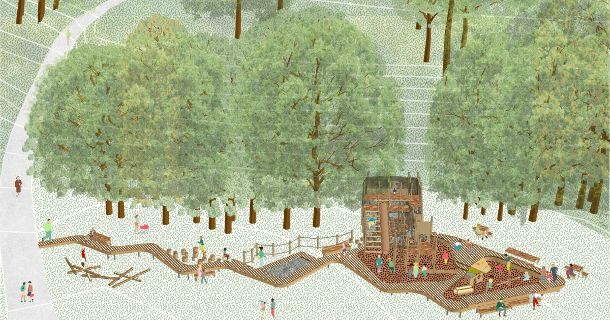 Dans la partie la plus basse du parc, une aire de jeux en bois s'intègrera harmonieusement en bordure de forêt. Son emplacement préservera les perspectives ouvertes de la plaine.