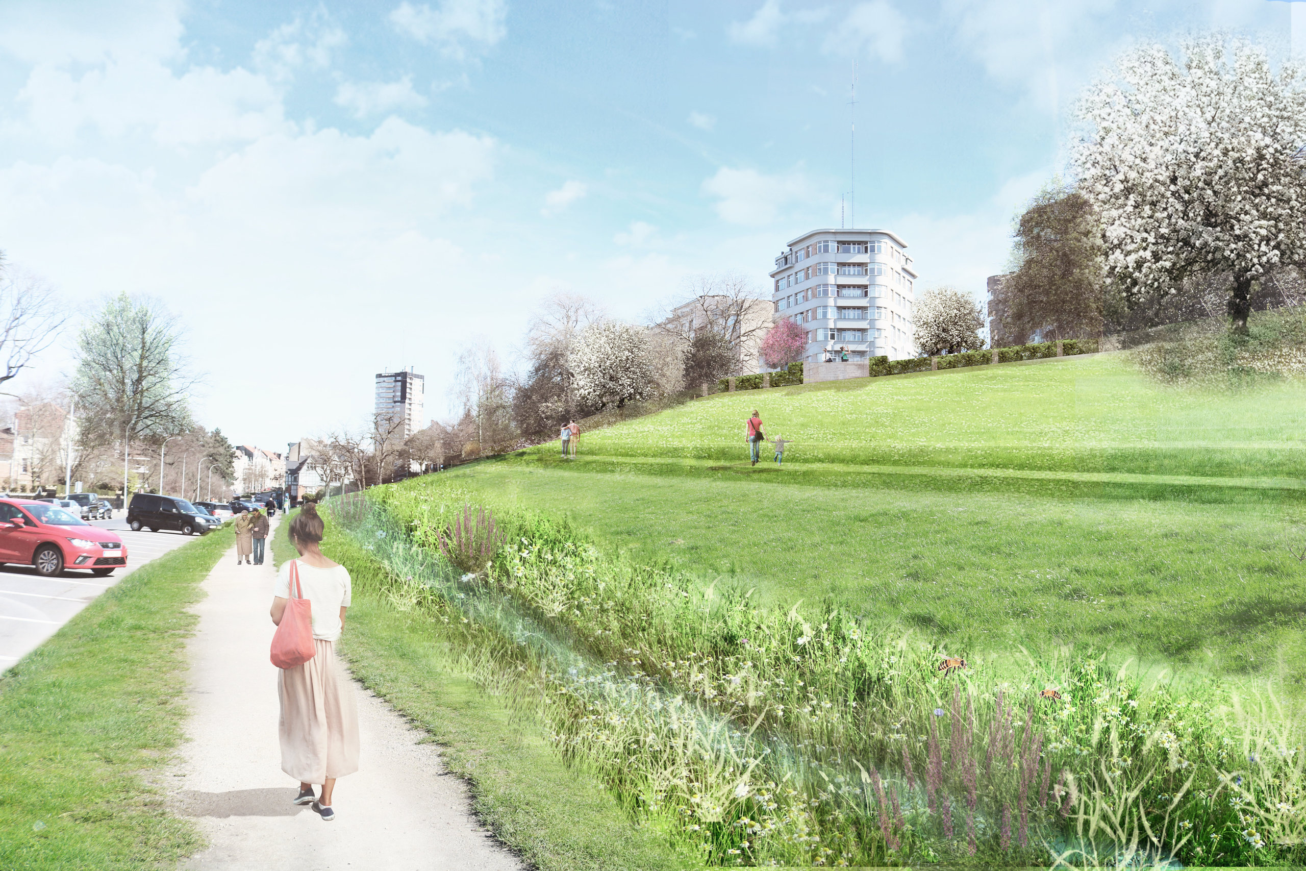 Aujourd'hui, lors de fortes pluies, le parc est inondé. C'est pourquoi des pelouses et des zones d'infiltration seront créées afin que l'eau de pluie puisse mieux pénétrer dans le sol. Les chemins et talus érodés seront restaurés de manière à mieux réguler les flux d’eau au sein du parc.