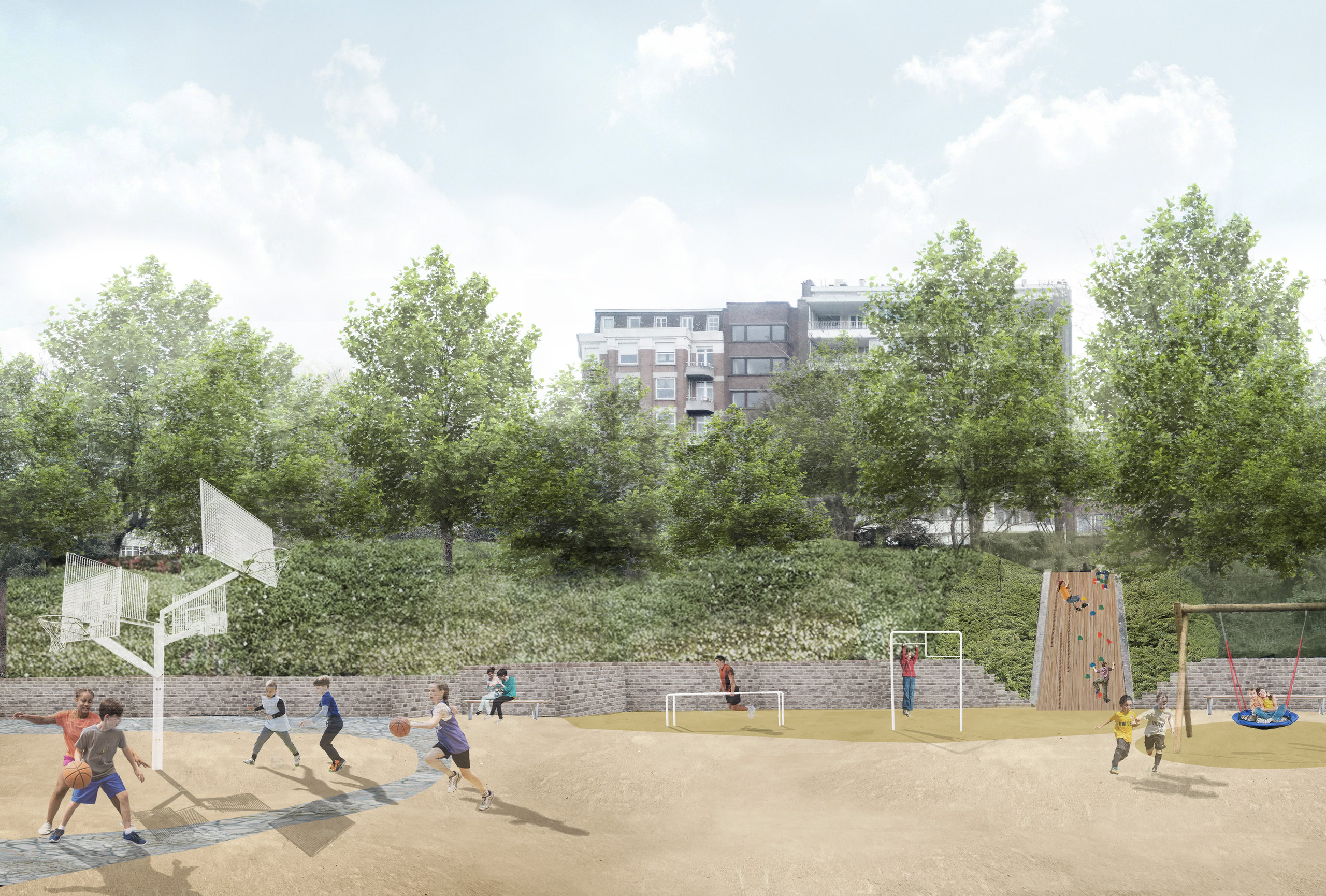 Le plus grand changement concerne la zone située en bas de l'escalier entre les avenues Besme et Jupiter. Ici, de nouveaux équipements sportifs et un mur d'escalade sur l’escalier seront aménagés. Entre cette placette et l'aire de jeux existante, des équipements de jeux supplémentaires seront intégrés ici et là, avec un grand toboggan comme pièce maîtresse. Cela créera un grand parcours récréatif dans le talus.