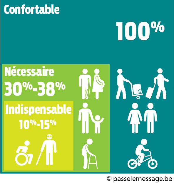 Le saviez-vous ? Environ 30 % de la population belge est considérée comme à mobilité réduite. Si les aménagements accessibles sont essentiels pour 10 à 15 % des personnes en situation de handicap, ils profitent en réalité à l’ensemble des usagers.