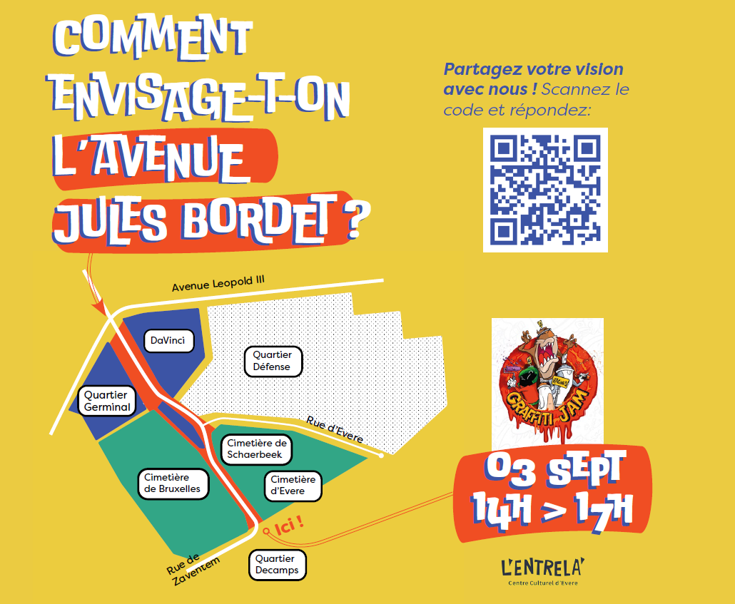 Vous êtes un habitant ou vous travaillez près de l’avenue Jules Bordet ? Venez rencontrer les concepteurs du projet lors de la Jam Graffiti Racines ! Rendez-vous le dimanche 3 septembre de 14h à 17h à l’intersection de la rue de Zaventem et de l’avenue Jules Bordet. Ou partagez votre vision via cette courte enquête avant le 17 septembre.