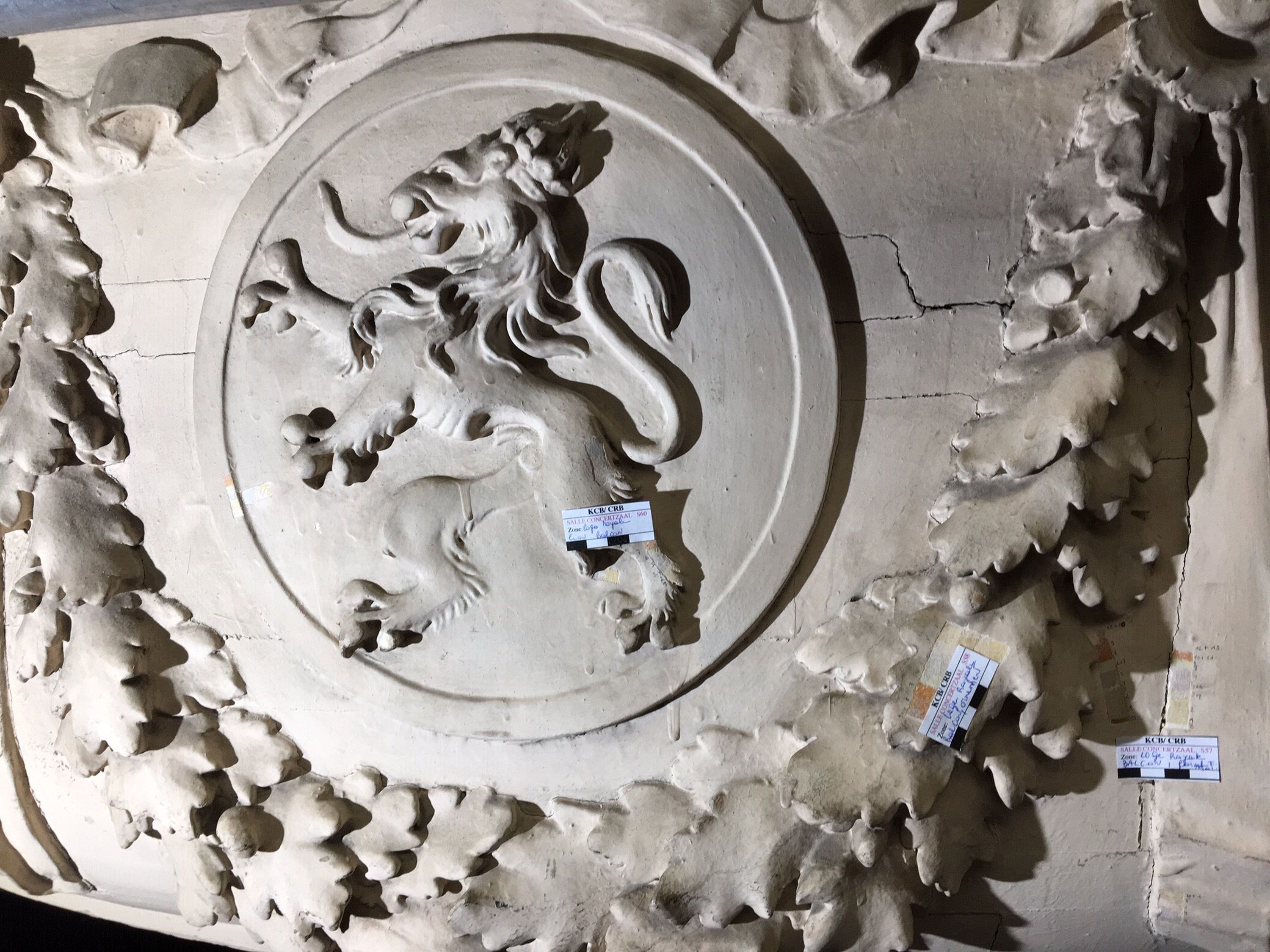 Krassen in de verf ? Inderdaad, maar niet per ongeluk: dit stratigrafische kraswerk legt de verfkleuren bloot die in de loop van de voorbije decennia op de muren werd aangebracht. Dankzij dit kleurhistorisch onderzoek wordt de evolutie van de polychromie achterhaald met als doel de ruimtes hun oorspronkelijke kleuren terug te geven.