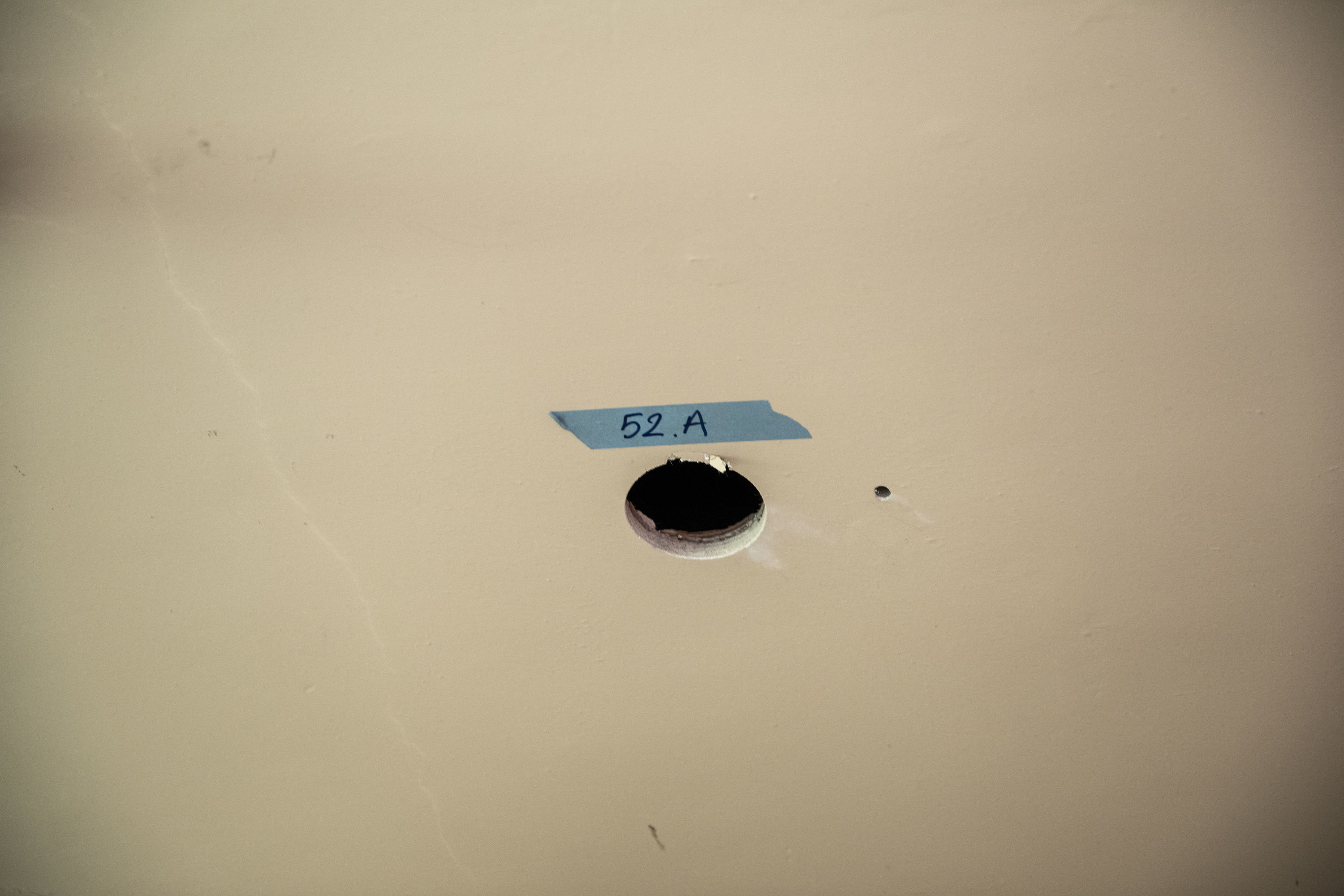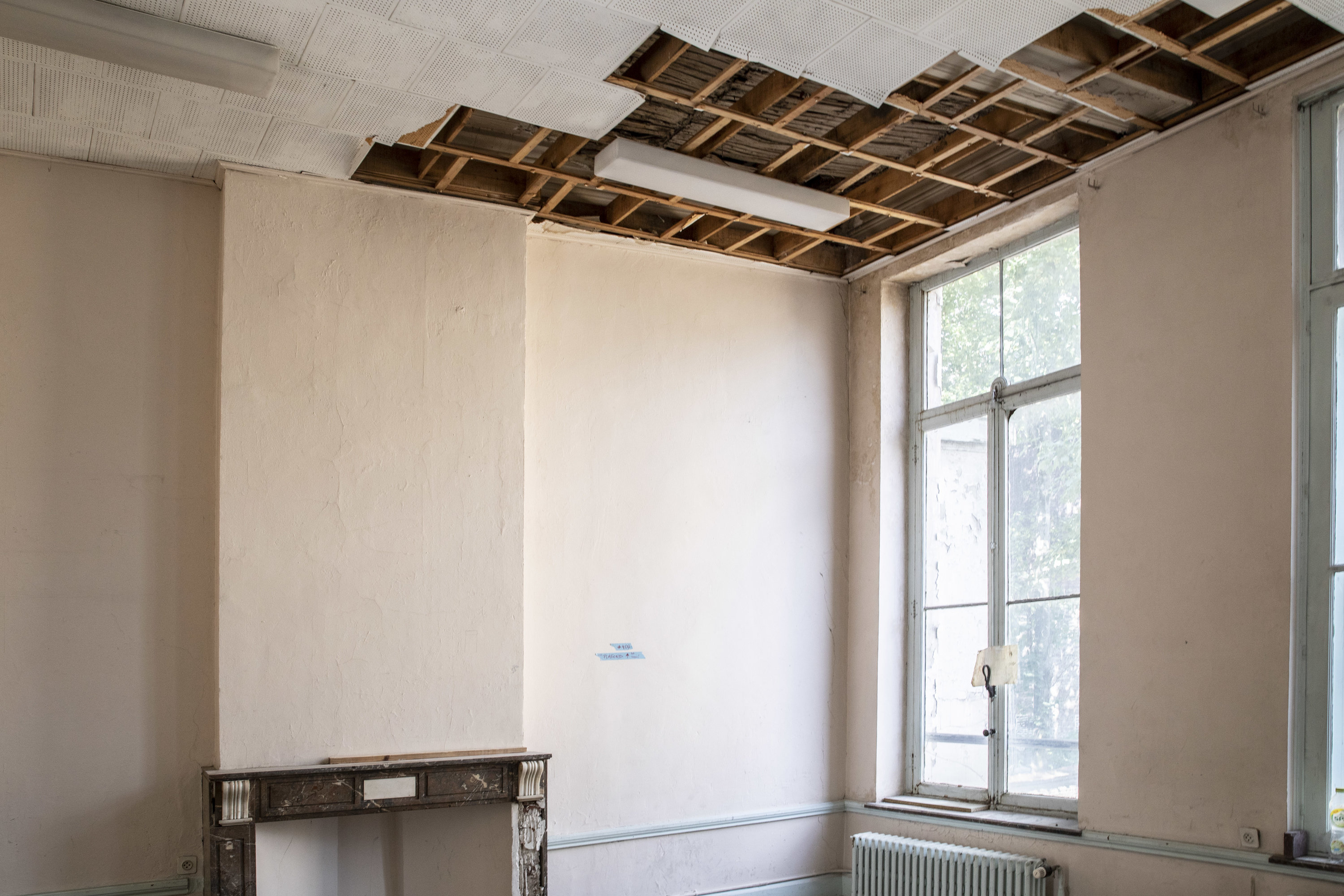 Is het plafond ingestort? Nee, hoor! (Nu ja, hier toch niet.) Door deze gaten in het plafond werd de onderliggende structuur blootgelegd. Het doel? Het draagvermogen van de volledige vloer berekenen aan de hand van de afmetingen van elke balk.