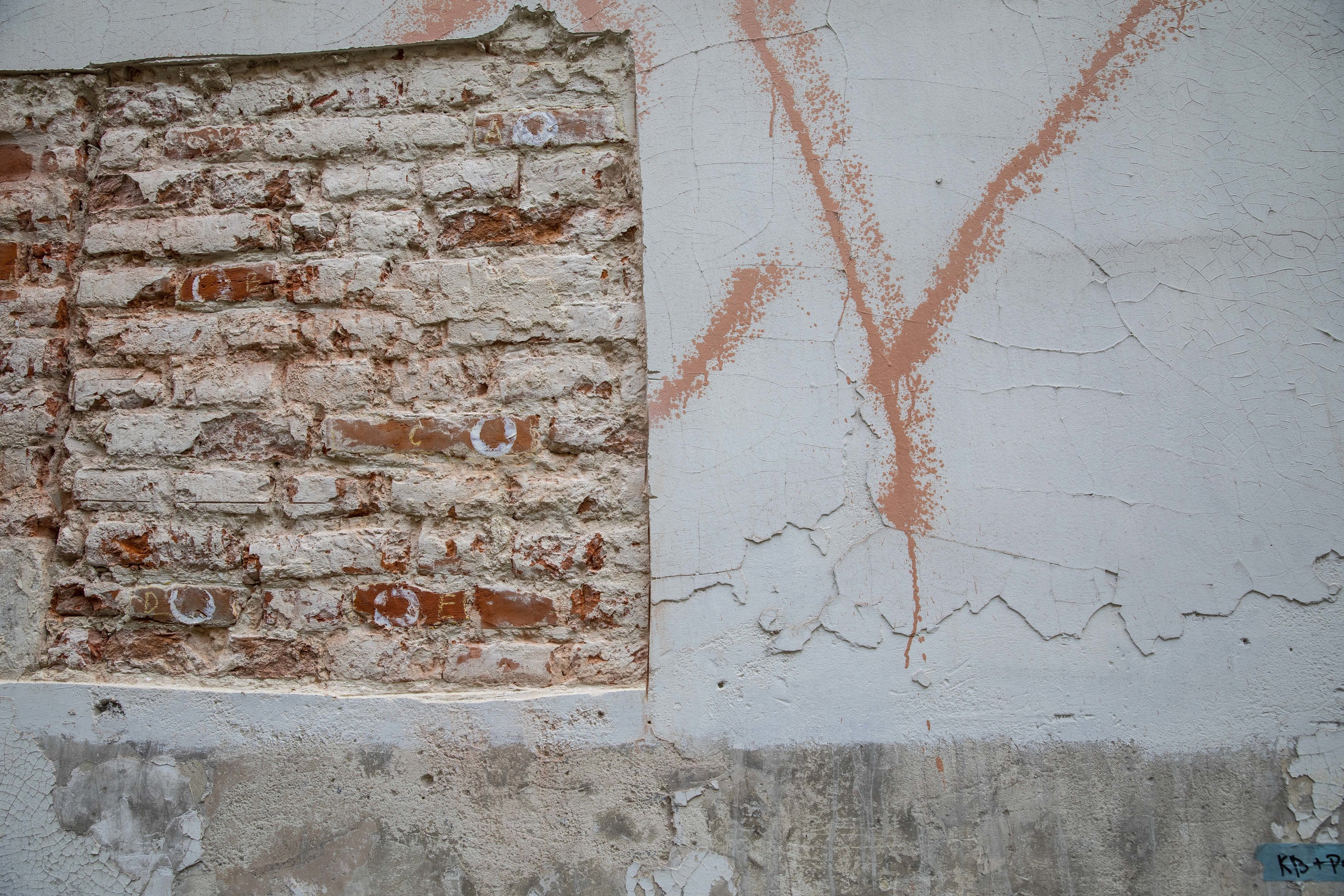 Gaten in het pleisterwerk ? Nee, hoor. Dit zijn testvlakken waar een Karstenpijpmeting werd uitgevoerd om de waterabsorptie van de stenen gevel te achterhalen. Het nut hiervan? De staat van de bakstenen achterhalen en bepalen of een waterwerende behandeling nodig is of niet.