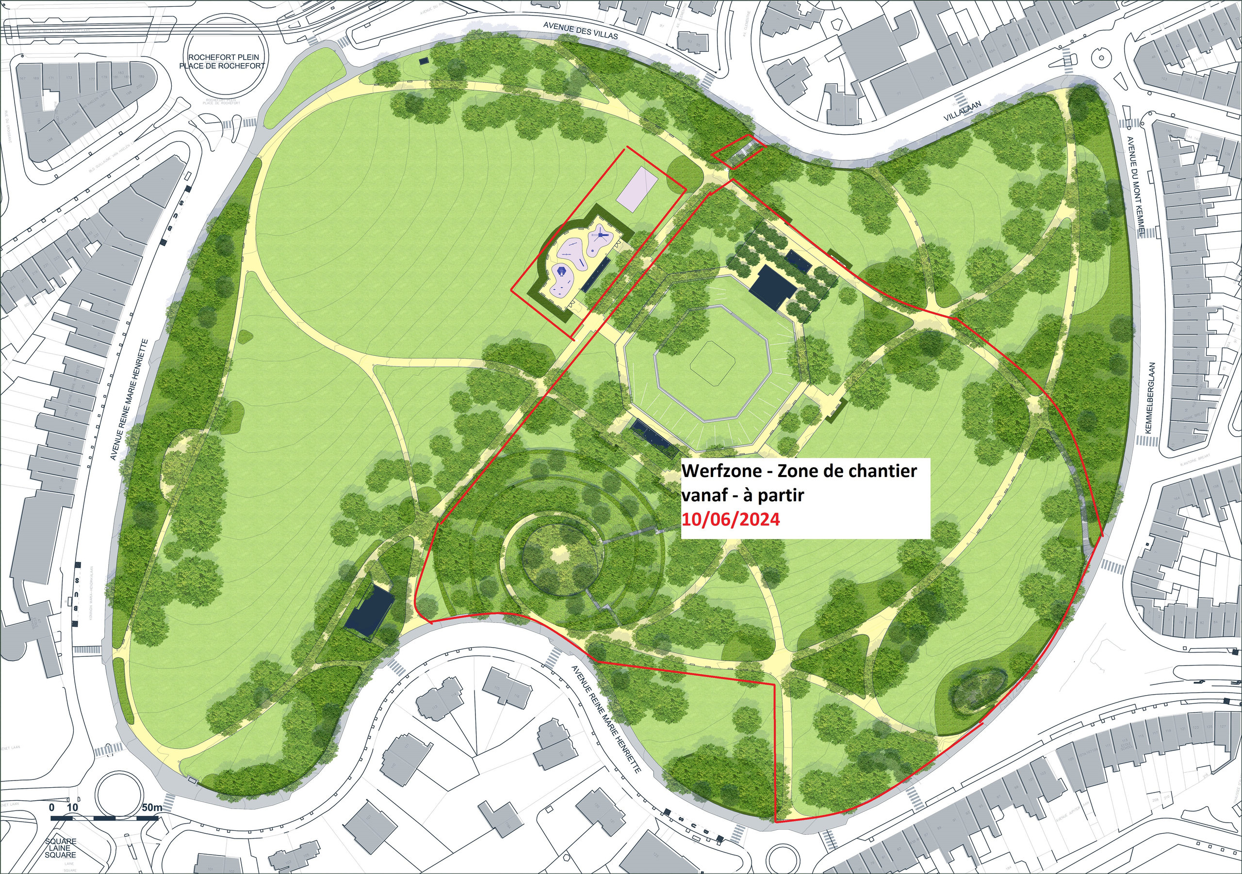 Deze twee zones, octogoon en heuvel, zullen de laatste zijn om af te werken. Vanaf midden juli wordt het merendeel van het park geopend, en zullen enkel deze twee zones, de toegangswegen hiernaartoe en de speeltuin, die vanaf september door de gemeente wordt ingericht, nog werfzone zijn.