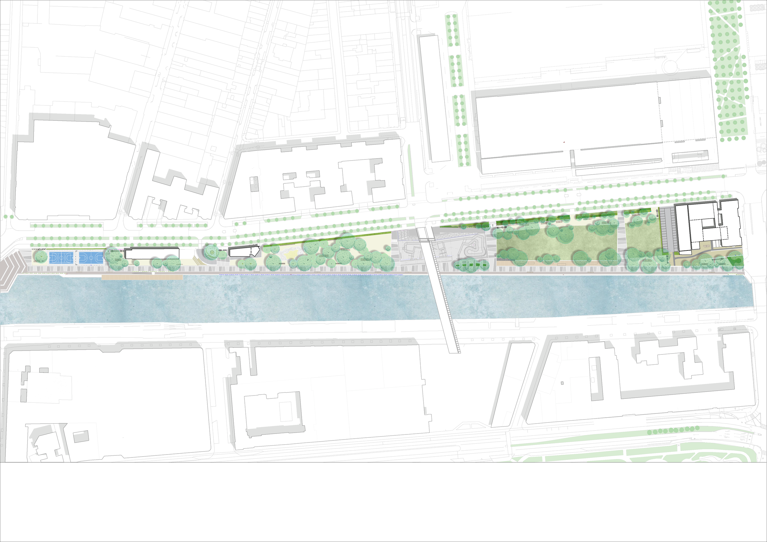 Het park start aan Sainctelette met een dubbele sportkooi, gevolgd door het voormalige pakhuis van Ackermans waarin de parkwachters zullen worden ondergebracht, evenals openbare toiletten, een gemeenschapsruimte en een bistro. Daarop volgt een ruime openbare tuin met banken, tafels en een zandbak. Wat verderop, onder de Suzan Danielbrug, zullen skaters zich kunnen uitleven met skateborden, rolschaatsen of steppen in een skatepark. Deze plek vormt ook de ideale scène voor de organisatie van allerhande activiteiten door de aanwezigheid van een tribune. Tegenover Tour & Taxis vormt een ruim grasveld afgeboord door een houten terras de perfecte locatie voor uitgestrekt genieten van de zon, frisbeeën, en andere buitenactiviteiten.